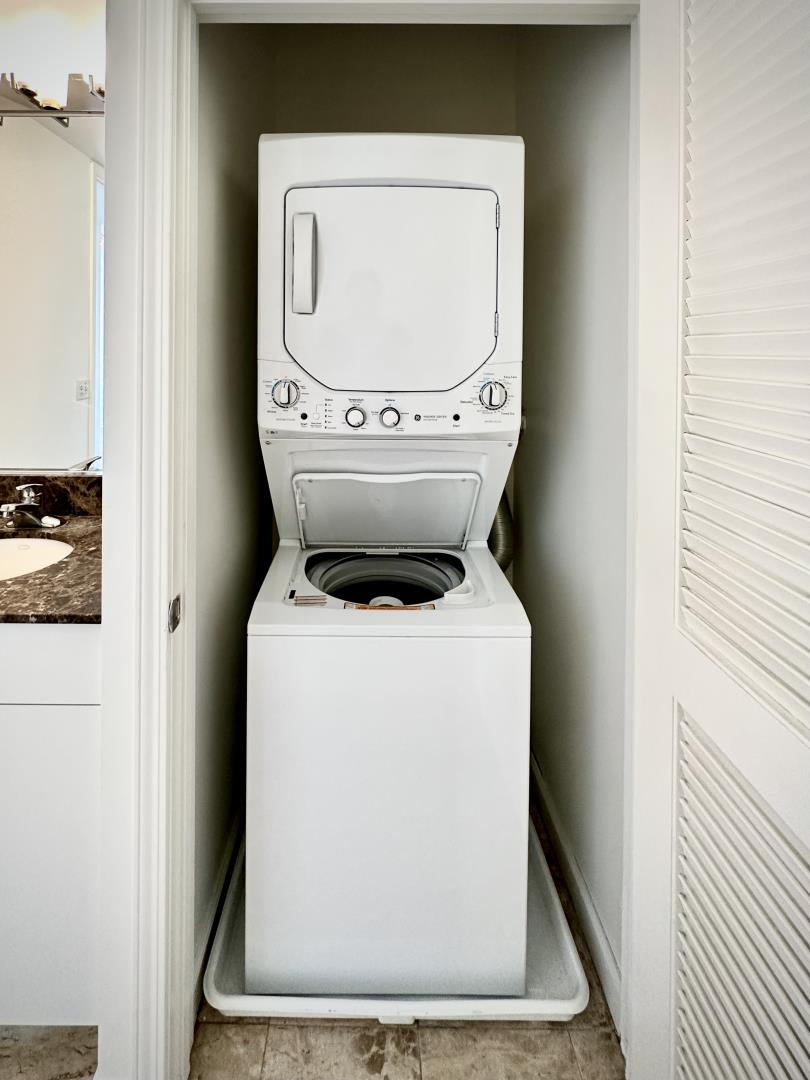 Bright, serene top-floor 1BR/1BA condo at the crossroads of SoMa, Mission, Hayes Valley, and Civic Center. Airy open-concept layout with high ceilings, classic molding, and new hardwood floors throughout. Kitchen features black granite countertops and like-new stainless electric appliances. Updated bath showcases natural stone, modern gold fixtures, and in-unit washer/dryer. Spacious bedroom includes a huge walk-in closet, ideal for a home office plus built-in shoe storage. Additional linen and utility closets provide ample storage. South-facing windows flood the home with natural light and offer stunning sunset views spanning the Mission District to Bernal Peak. Solid concrete walls ensure exceptional soundproofing. LED track lighting in the living room and HomeKit-compatible smart ceiling fans with lights in both rooms. Full amenities include a 24/7 gym with yoga/dance studio, courtyard with BBQs, conference room, and secure package area. Excellent walk, bike, and transit access: buses 49 and 14/14R at the door, 10-minute walk to Van Ness Muni and 16th St Mission BART. Tech shuttles stop out front. Secure, attached garage parking available for lease, with convenient access via Mission Street and South Van Ness, putting you just seconds from Highway 101.